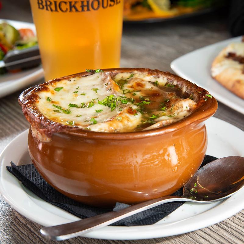 Slow-cooked, caramelized onion blend in a rich beef stock, topped with a garlic herb crostini and melted provolone.