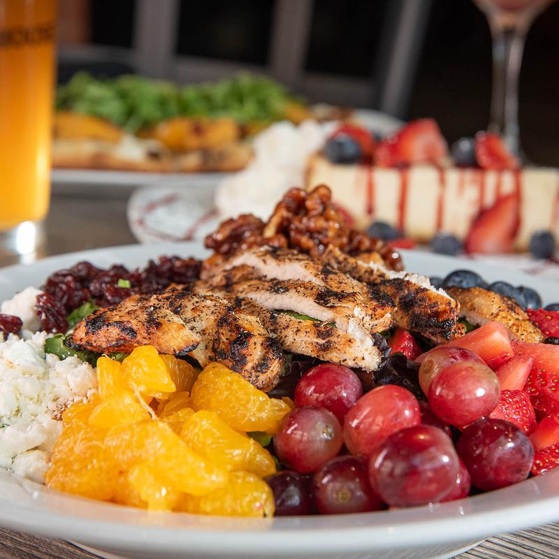 Salad greens topped with mandarin oranges, strawberries, blueberries, grapes, dried mi cherries, glazed walnuts, goat cheese, and raspberry vinaigrette | Chicken +$5.00 | Salmon +$7.00 | Grilled or Blackened.