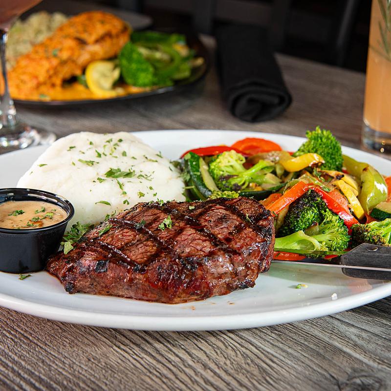 16 oz ribeye charbroiled, encrusted in a signature salt and pepper blend, and served with house-made zip and creamy mashedpotato and seasonal vegetable medley.